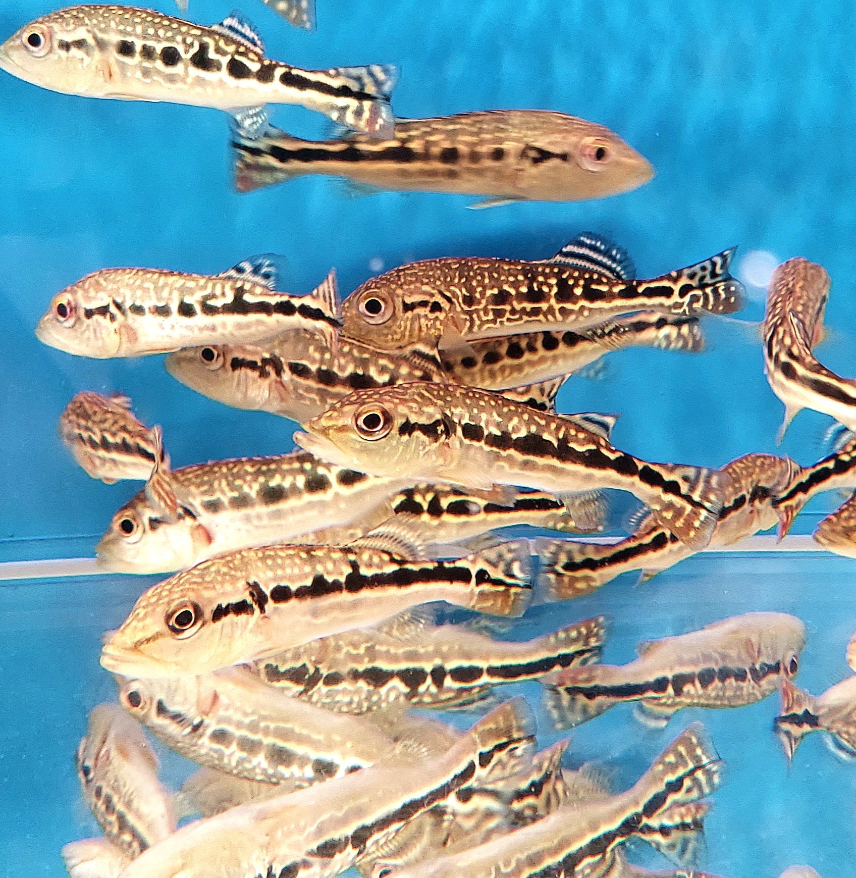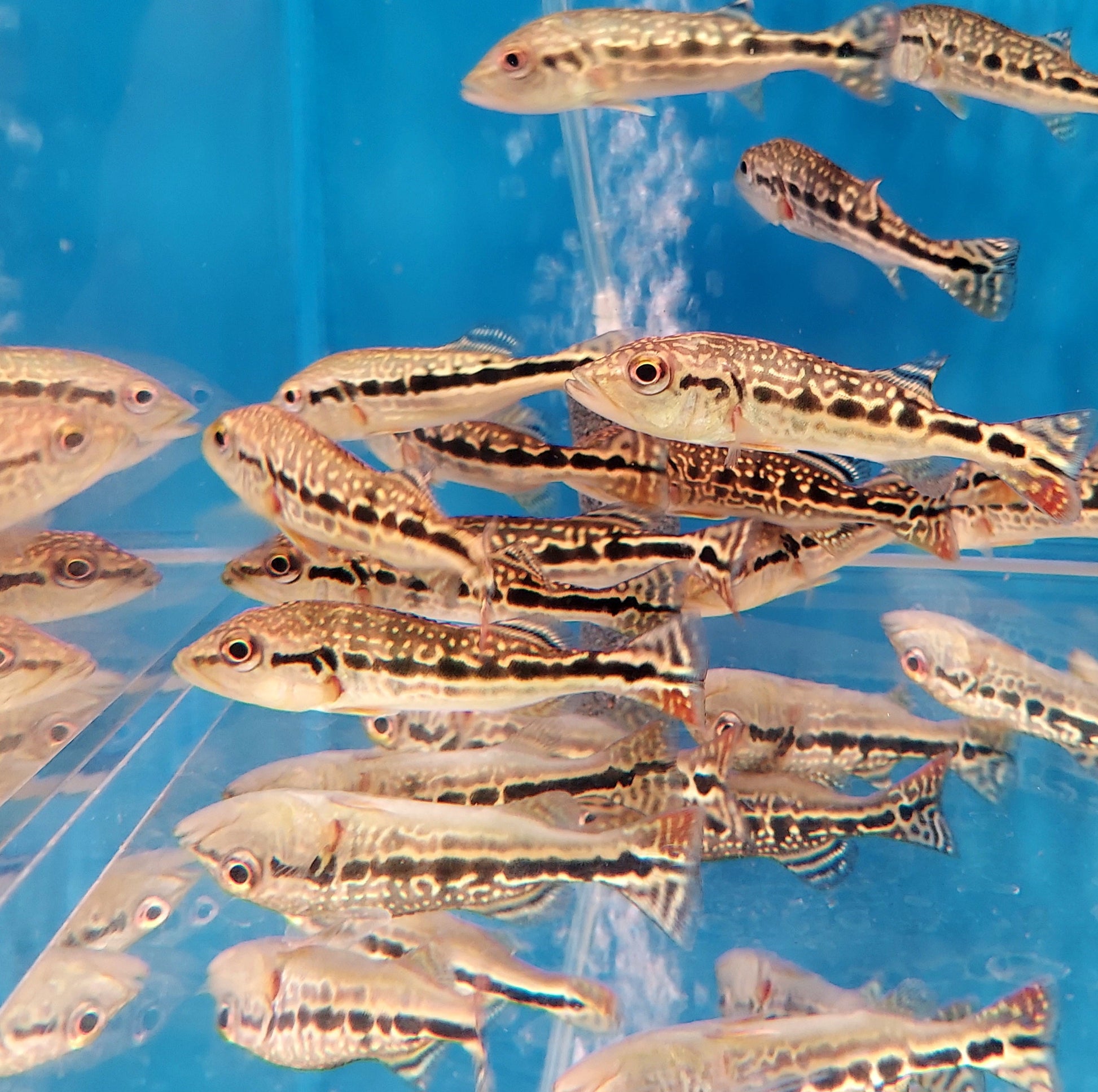 Cobra Snakeskin Peacock Bass is a selectively breed hybrid of multiple species and generations to create this unique intricate pattern. With distinctive golden coloration and a much smaller adult size than other peacock bass of the genus Cichla, it make a great addition into your tank.
