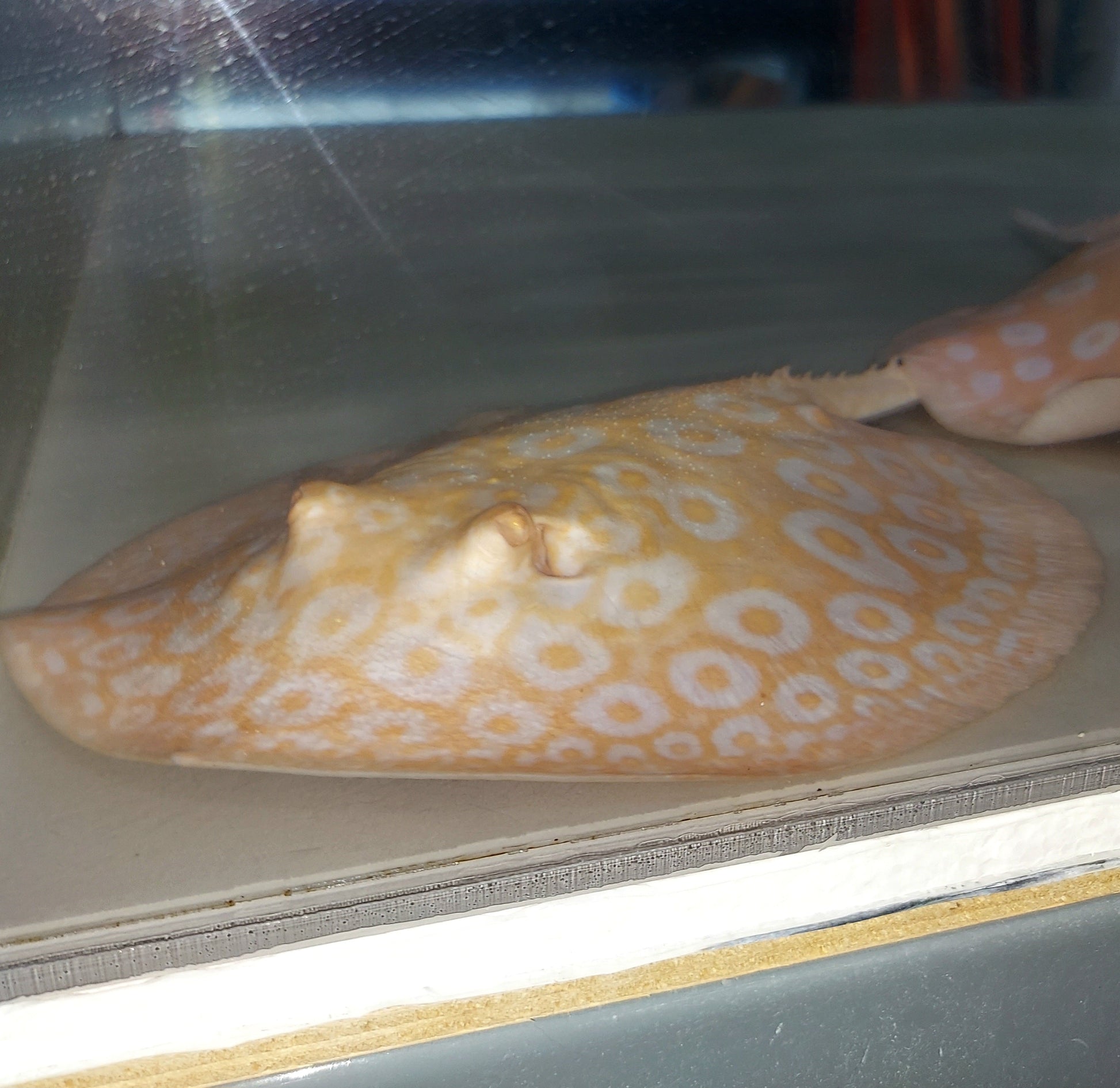 The Pearl Stingray originates from the Tapajos River in Brazil. It is characterized by a golden brown base with black rings. In this albino morph, the colors are reversed so we get white rings on a golden yellow base, not be confused with the red base albino type.