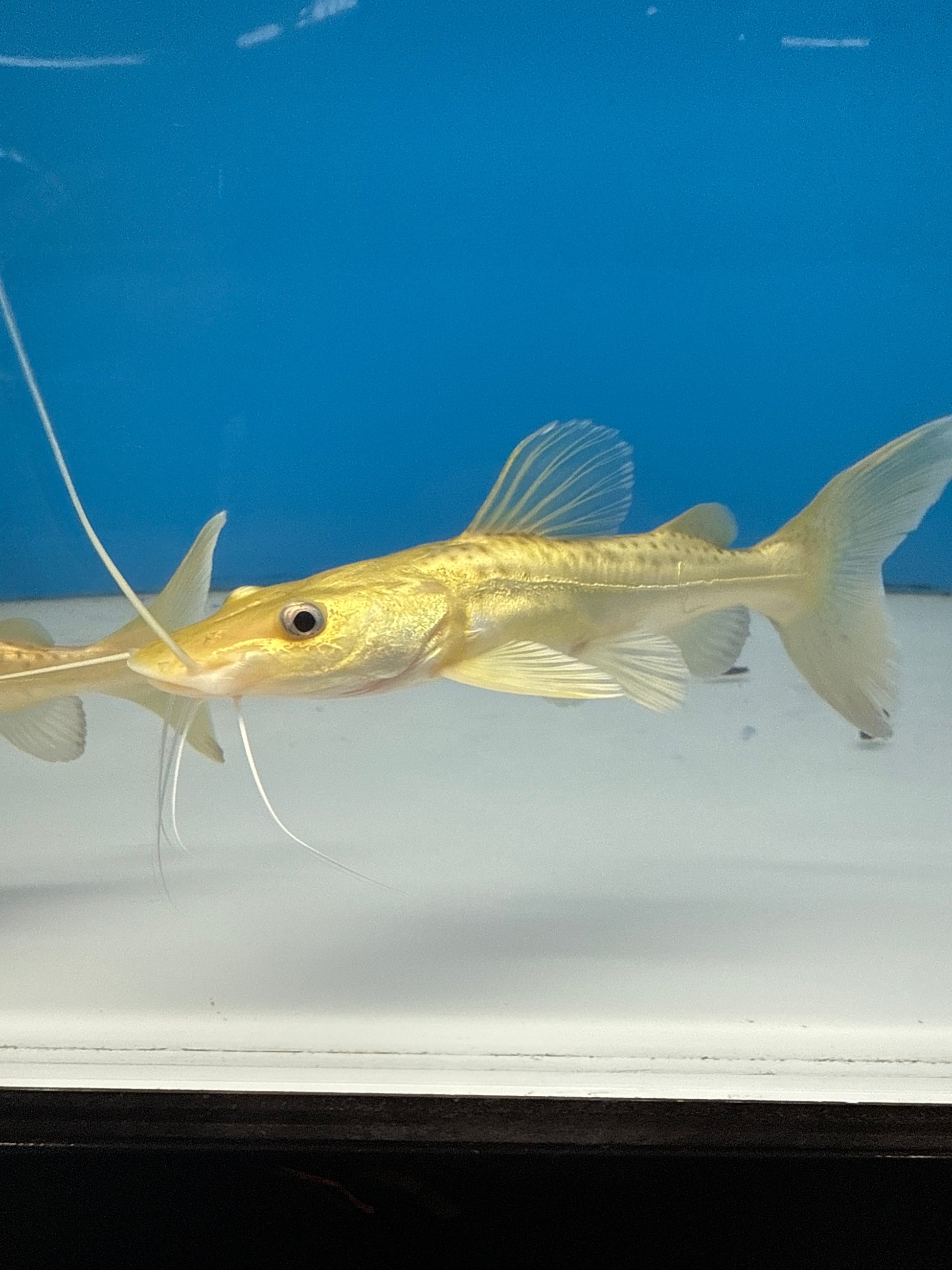 This golden variant is a color morph with metallic golden color. Also known as the Red-Tailed Leopard Tiger Shovelnose Catfish. This is a hybrid Catfish that grows to a large size and is thought to naturally occur in the wild in rivers in South America. It is a cross between a regular Tiger Shovelnose and a Red-Tailed Catfish. This fairly new species is becoming popular with many collectors, hobbyists and zoos everywhere. It has only recently been made available to the aquarium industry and farms like ours are now able to offer these awesome hybrids more readily as the population of successful fry is raised.