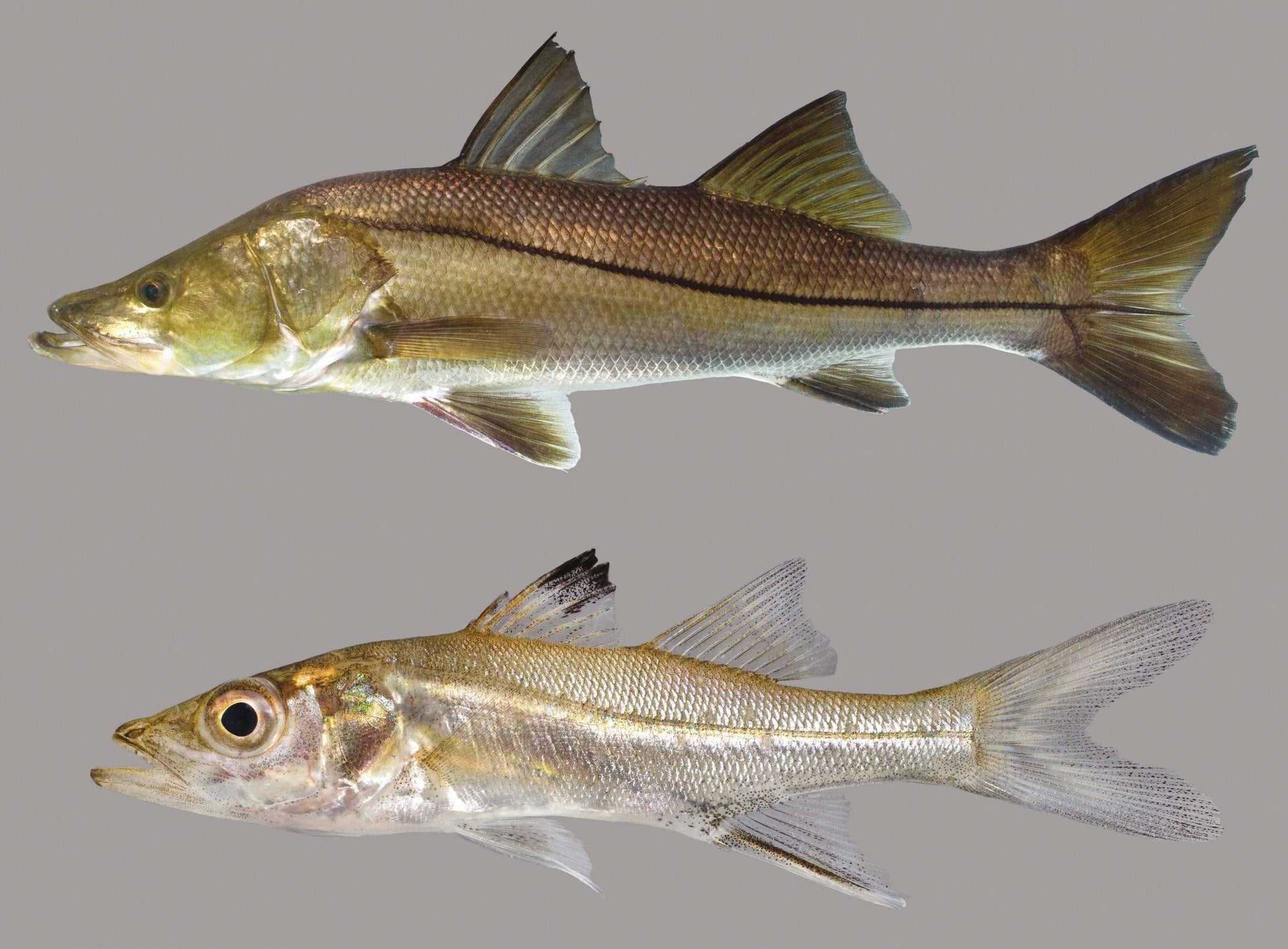 Snook have long, convcave snouts with jutting underjaws. The lateral line is pigmented and distinct, extending well into the tail. Coloration ranges from dark brown on back to silvery on the sides and white below. They can live in both freshwater and saltwater.